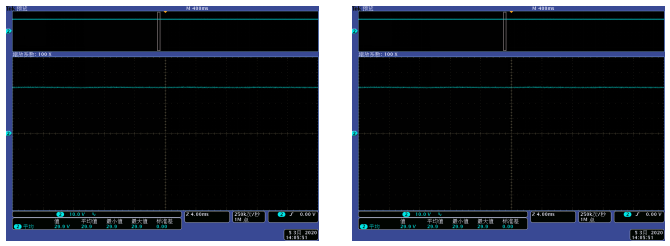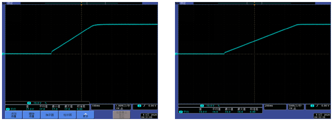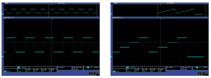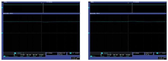 Forme d'onde de réponse dynamique de sortie inférieure à 10% ~ 50% de changement de charge | Forme d'onde de réponse dynamique de sortie inférieure à 50% ~ 10% de changement de charge |